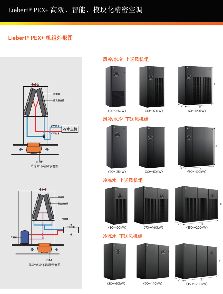 Liebert PEX 機(jī)房專用精密空調(diào)包括風(fēng)冷、水冷、乙二醇冷、風(fēng)冷/冷凍水雙冷源、水冷/冷凍水雙冷源、Free Cooling自然冷、冷凍水、冷凍水雙盤(pán)管等多種型式。制冷量范圍寬,風(fēng)冷、水冷、乙二醇冷機(jī)組20kW~100kW,冷凍水機(jī)組28-200kW。高可靠性、高靈活性、全壽命成本。完全滿足大,中型交換機(jī)房,移動(dòng)機(jī)房,數(shù)據(jù)中心等高標(biāo)準(zhǔn)要求。 |